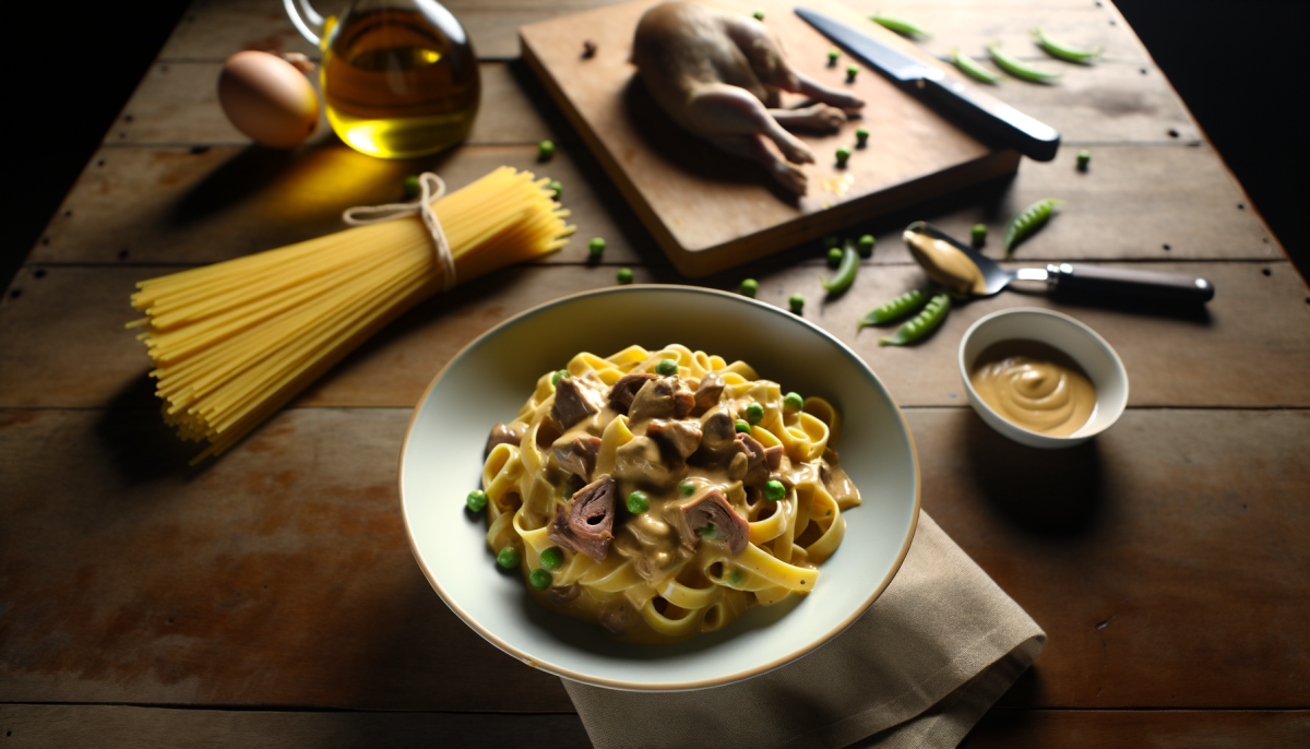 This creamy rabbit pasta is cooked in a rich and tangy mustard sauce that's just the right amount of savory and creamy. The peas add a sweet and fresh touch to the dish, perfectly balancing the creaminess of the sauce. This is an ideal dish for those with intermediate cooking skills, and a enjoyable pasta meal with a unique twist.