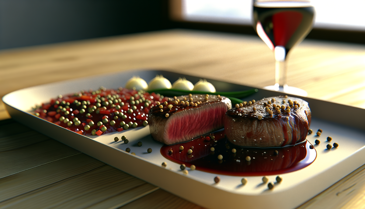 6. Add the red wine and green peppercorns, and cook until the sauce is reduced by half.